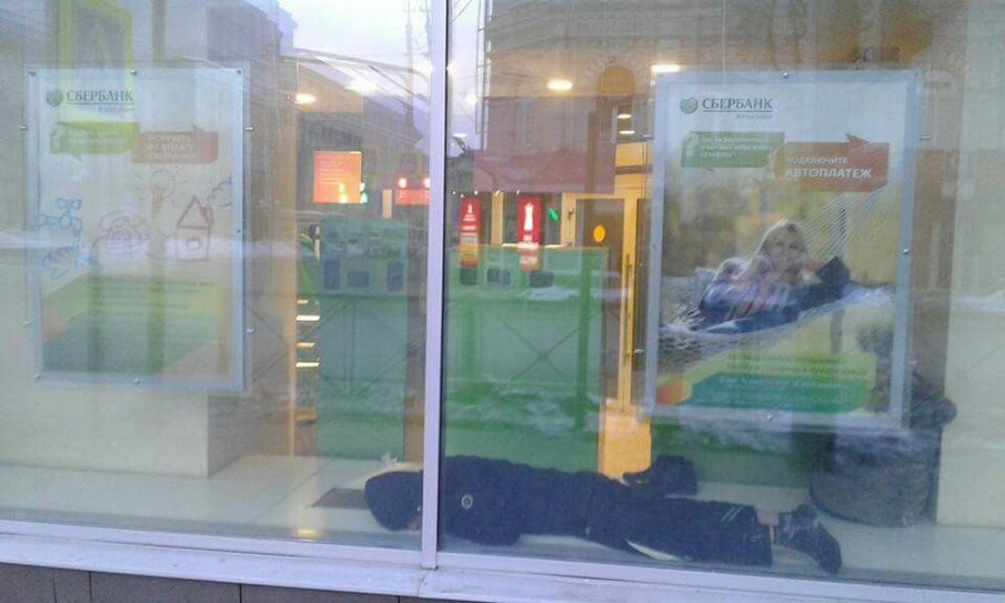 Cпят усталые... Пензенец всю ночь пролежал за стеклом «Сбербанка»