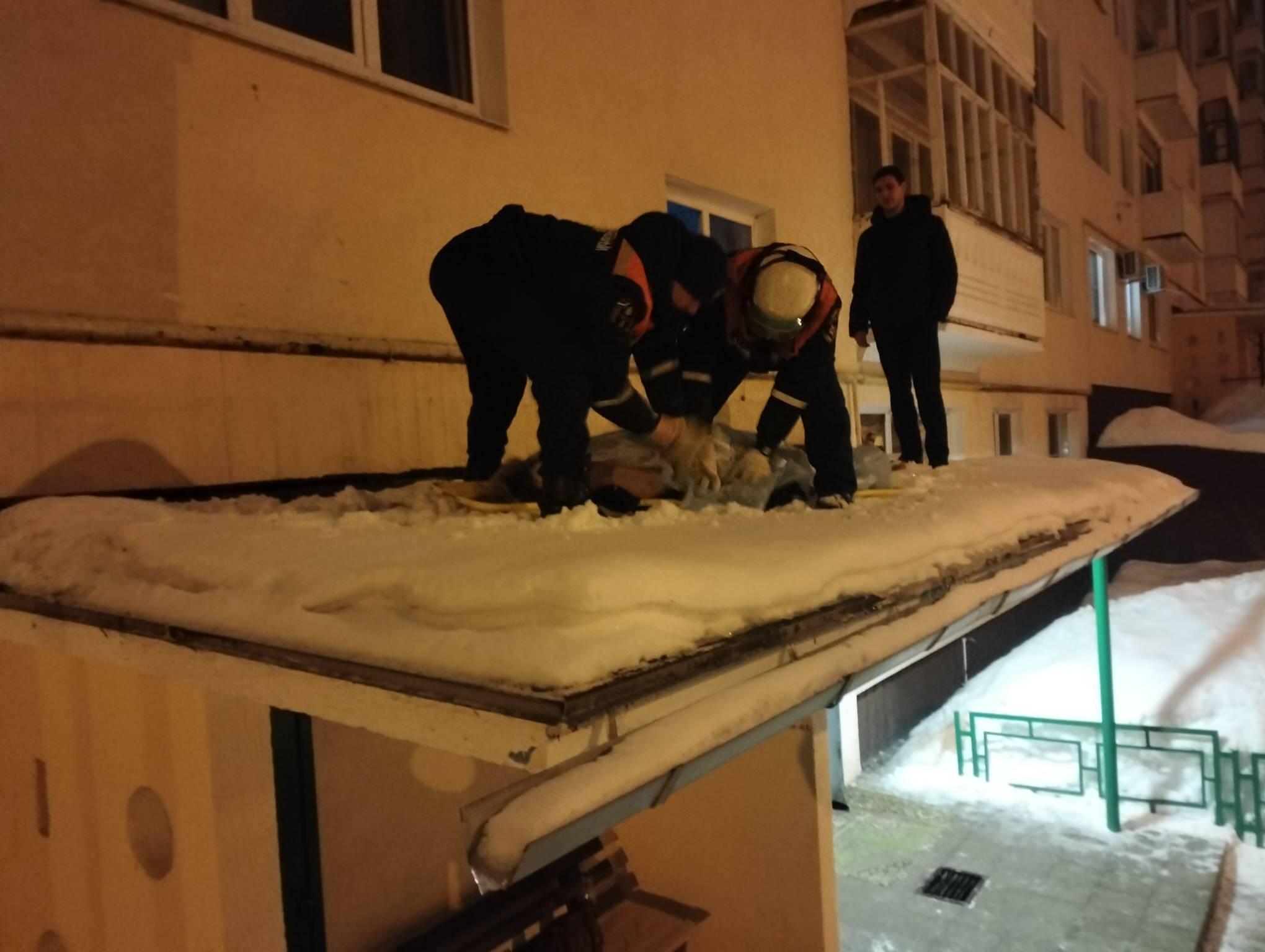 На место прибыли спасатели. Им пришлось подниматься на козырёк, чтобы извлечь тело. После этого погибшую уложили на носилки и аккуратно спустили вниз.